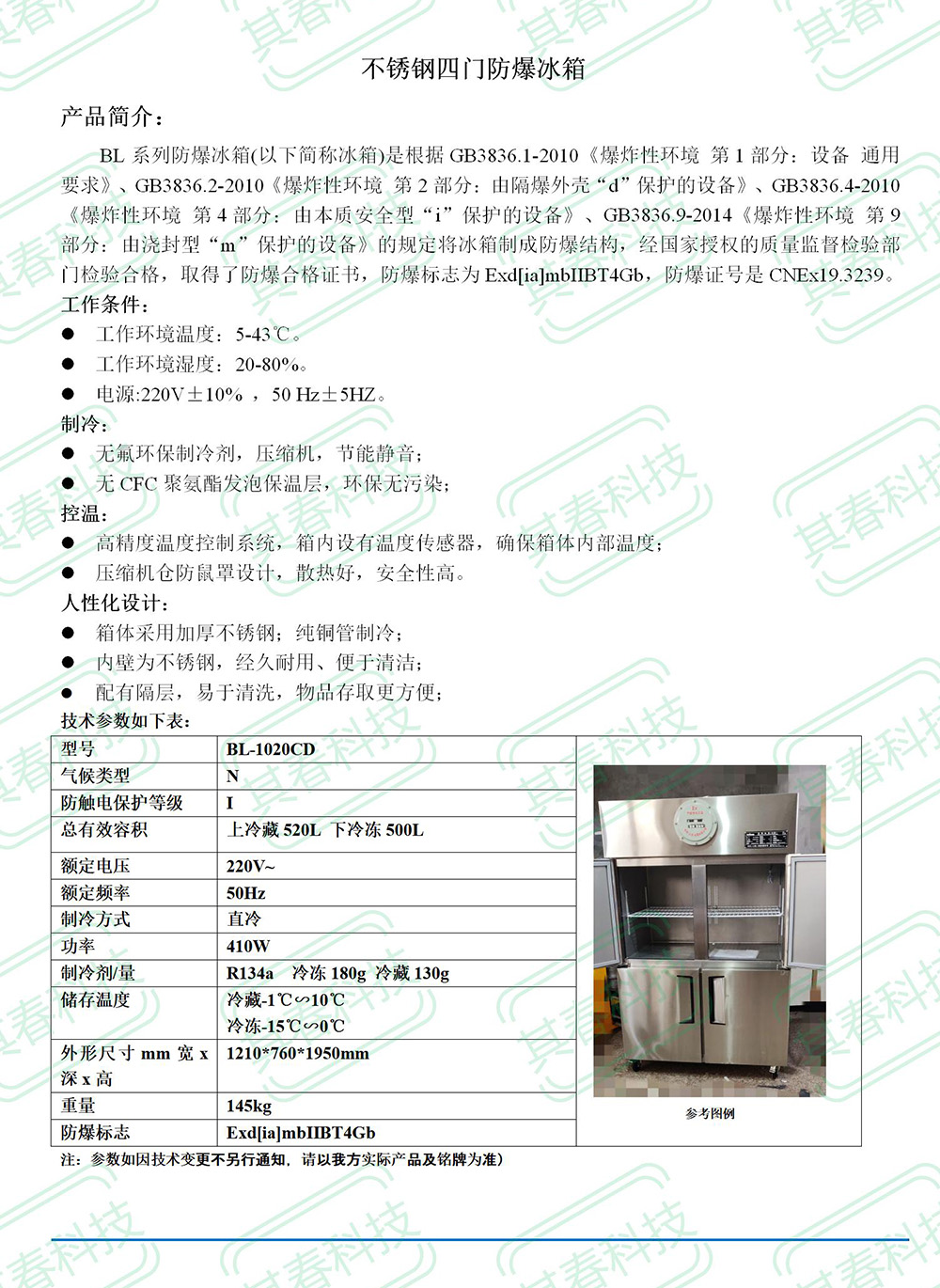 冷藏冷冻防爆四门冰箱不锈钢定做BL-1020CD